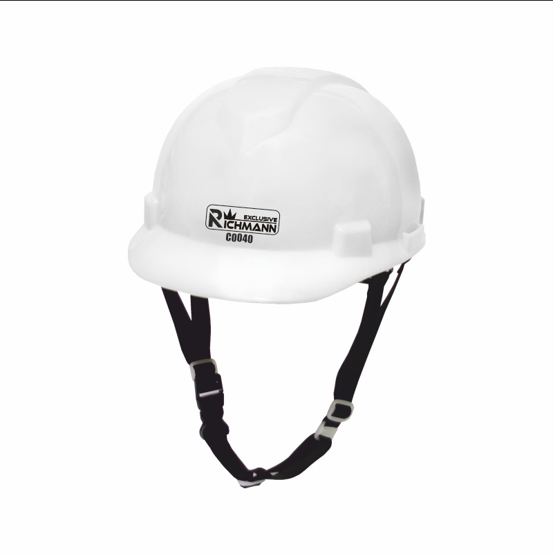 Wysokiej jakości budowlany kask ochronny w kolorze białym z 4-punktowym mocowaniem paska podbródka