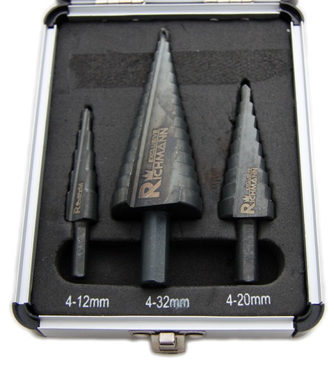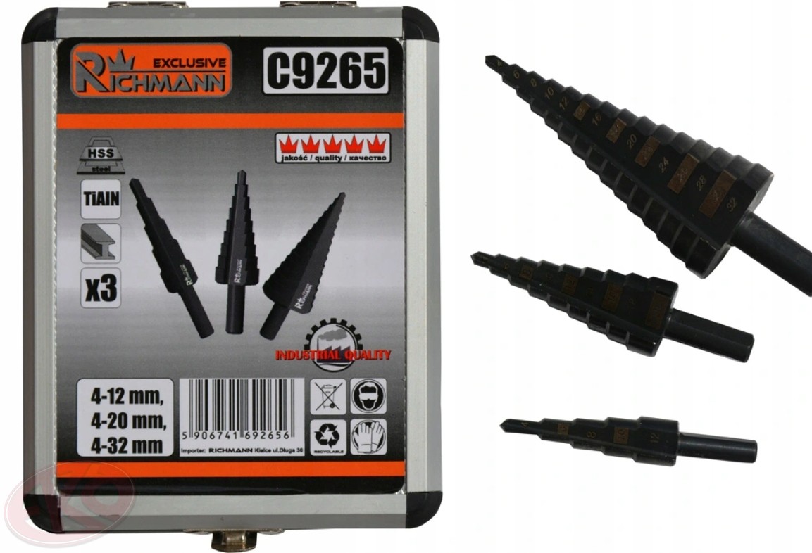 - Zestaw 3 sztuk wierteł przeznaczonych do wiercenia otworów w metalu i stali w zakresie 4-12mm, 4-20mm, 4-32mm